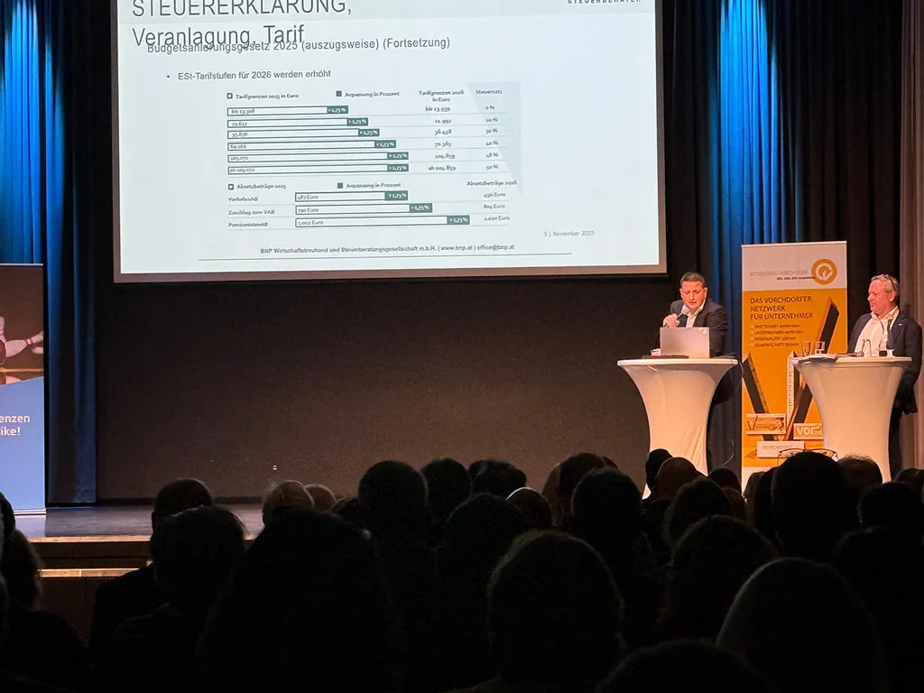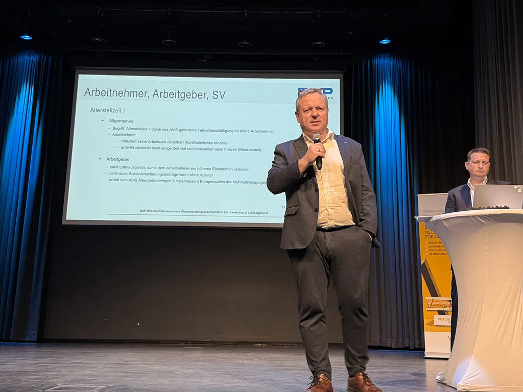 Wertvolle Tipps zum Jahresende lieferte das Team der BNP Steuerberatung. Mag. Manfred Schima und Stefan Huemer, BA informierten über aktuelle steuerliche Neuerungen und relevante Themen wie Steuererklärung, Immobilien, Teilpension oder geringfügige Beschäftigungsverhältnisse.