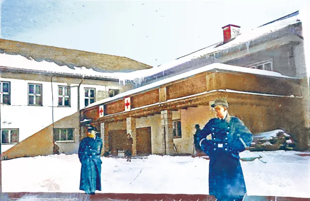 Foto aus 1944 vor der Vorchdorfer Schule im Winter: fotografiert vom US-Soldaten Reece Stephenson, der damals mit seinen Flugzeugkameraden abgeschossen wurde. Das Bild und eine unglaubliche Geschichte dazu kam nun von seinen Nachfahren aus den USA per E-Mail.