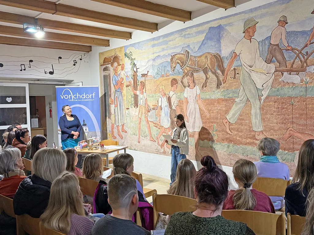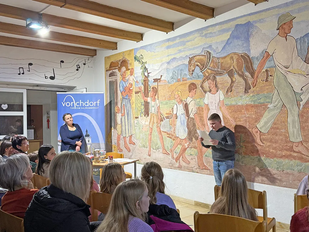 Schüler der Volks- und Mittelschule waren eingeladen, Aufsätze zum Thema „Was mir das Fresko erzählt“ zu verfassen. Insgesamt wurden 28 Beiträge eingereicht. Jeder Aufsatz wurde mit einem kleinen Preis gewürdigt, die Siegerinnen und Sieger – Rosa Hörtenhuber (4a VS Vorchdorf), Ludwig Radner (4a VS Pamet), René Weber (2c MS) und Leonie Ohler (3a MS Vorchdorf) – präsentierten ihre Texte direkt vor dem Fresko.