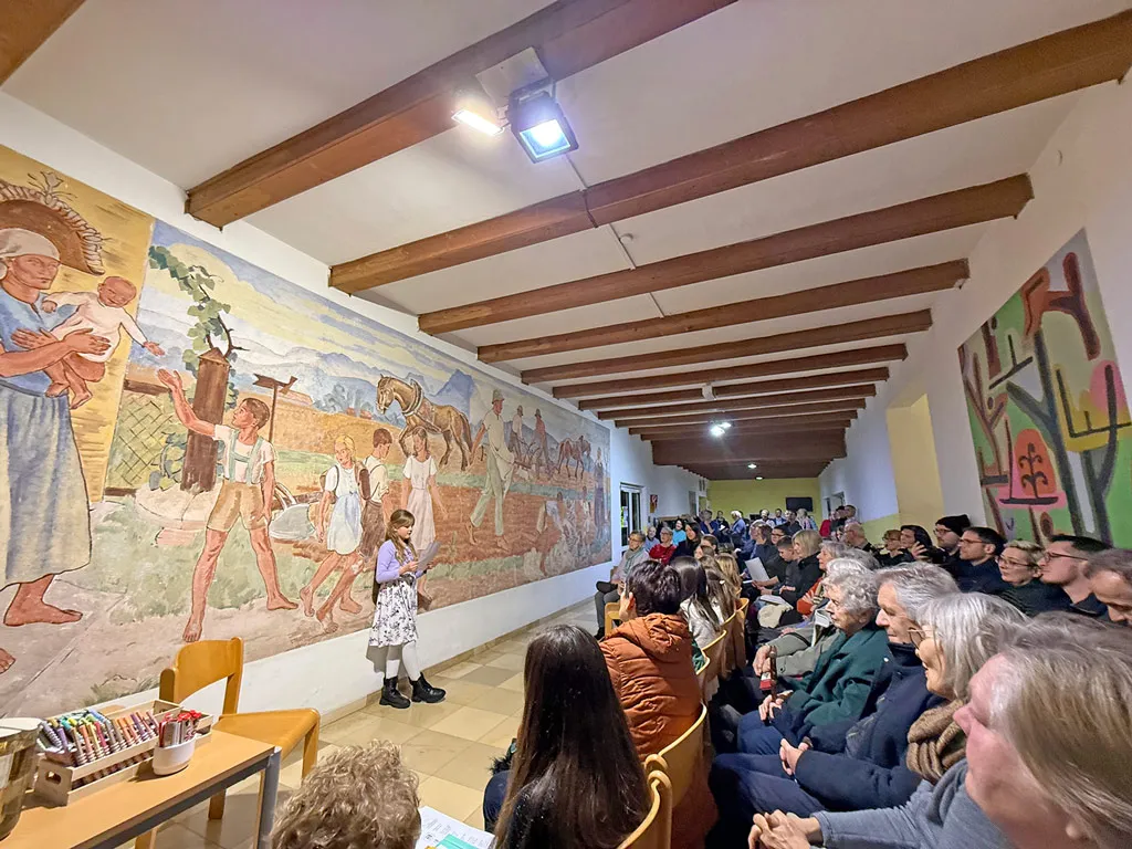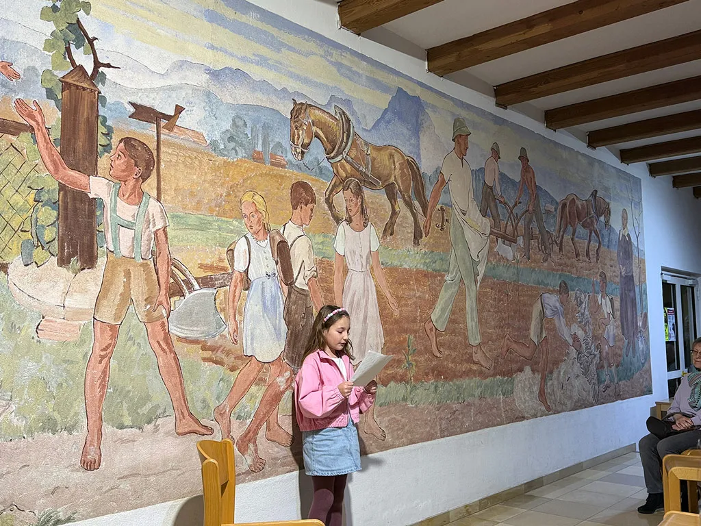 Einen besonders lebendigen Welttag der Bildung erlebten zahlreiche Besucher am 24. Jänner 2026 im Eingangsbereich der Mittelschule. Seit den 1940er-Jahren hat sich dieser Ort kaum verändert – ebenso wenig wie das monumentale Wandfresko des Künstlers Erwin Lang, das die Jahrzehnte nahezu unversehrt überstanden hat. Ganz im Zeichen dieses Kunstwerks stand die Veranstaltung, die vom Bildungs- und Kulturausschuss der Gemeinde initiiert wurde.