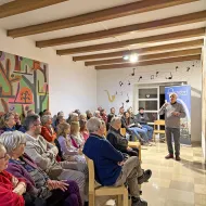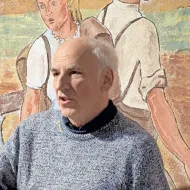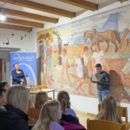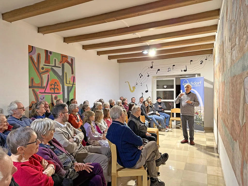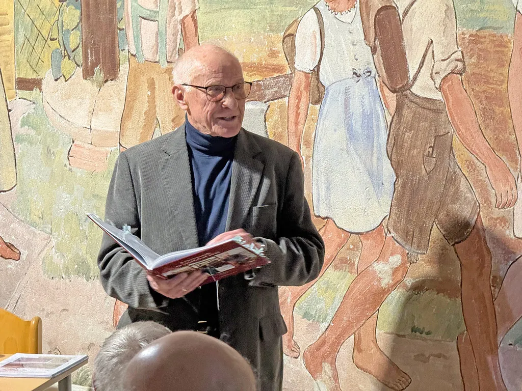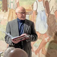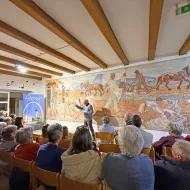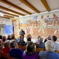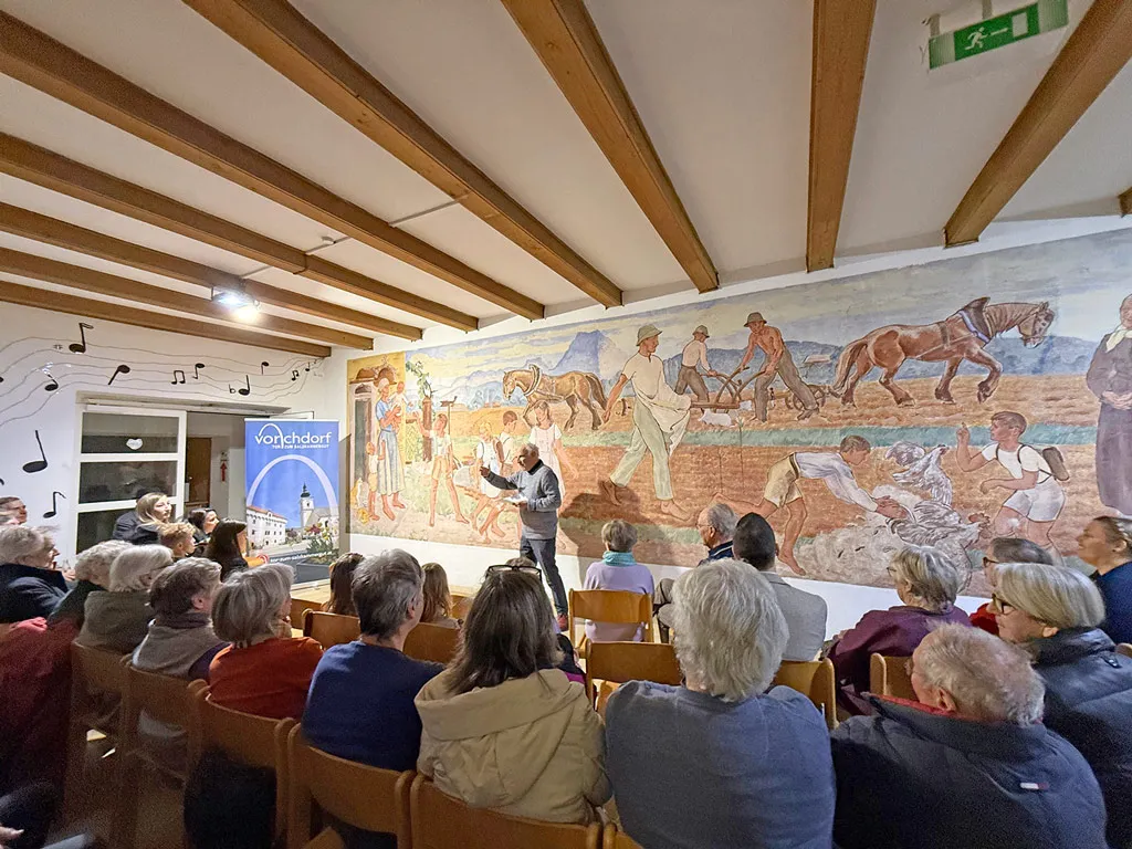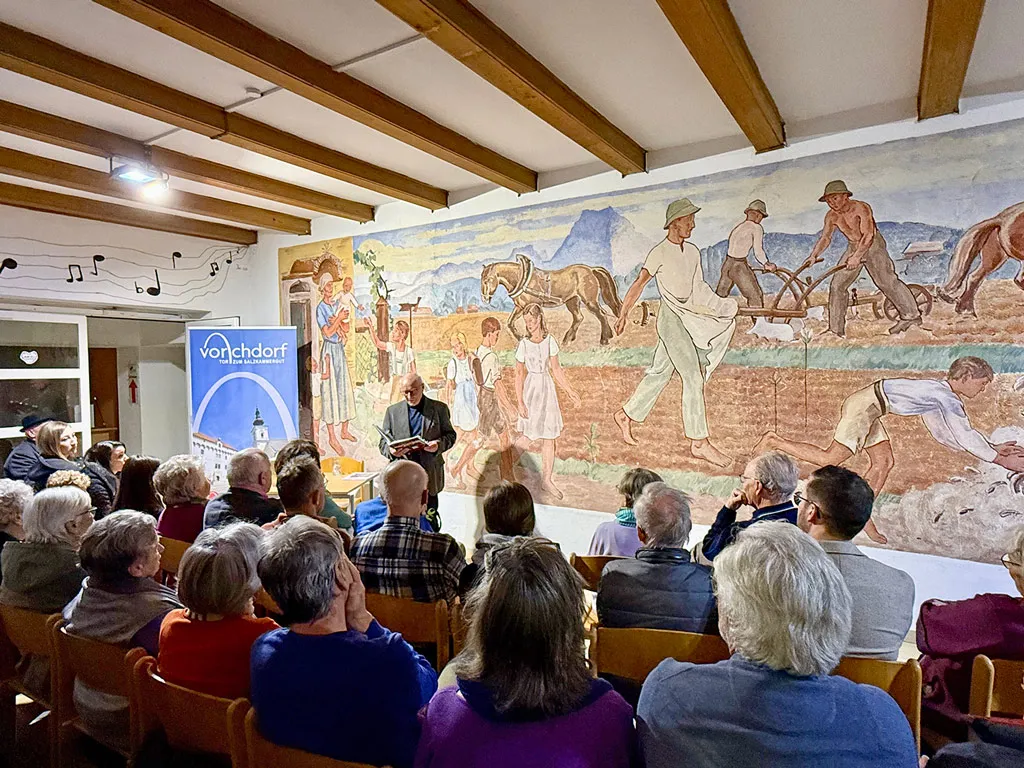 Sichtlich berührt nahm Bruno Schernhammer diese Gedanken auf. Er zeigte sich überzeugt, dass Erwin Lang über die Aufsätze der Kinder tief bewegt gewesen wäre – galt der Künstler doch als Meister von Bildern, die scheinbar in Bewegung geraten. In einem ausführlichen Vortrag schilderte Schernhammer seine Recherchen zum Fresko und zum bewegten Lebensweg seines Schöpfers. Trotz seiner Einstufung als „Halbjude“ erhielt Lang damals den Auftrag – und setzte ihn auf seine ganz eigene Weise um. Bewusst widersetzte er sich den ästhetischen Vorgaben der NS-Zeit. Schernhammer betonte zudem Langs prägende Erfahrungen nach dem Ersten Weltkrieg: Nach einer Kriegsgefangenschaft in Sibirien lebte Lang mehrere Jahre in China, wo er fernöstliche Drucktechniken kennenlernte, die sein späteres Werk nachhaltig beeinflussten.