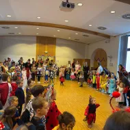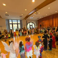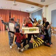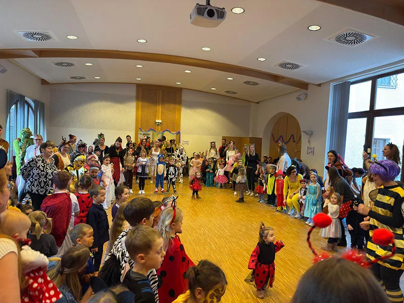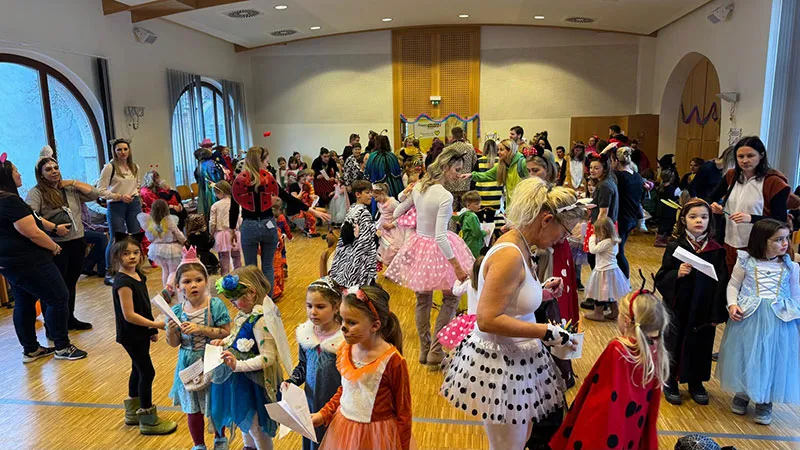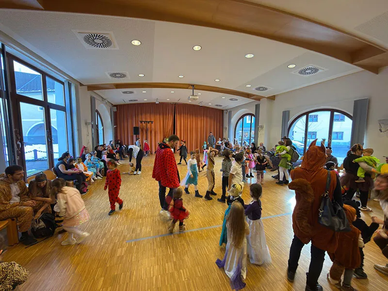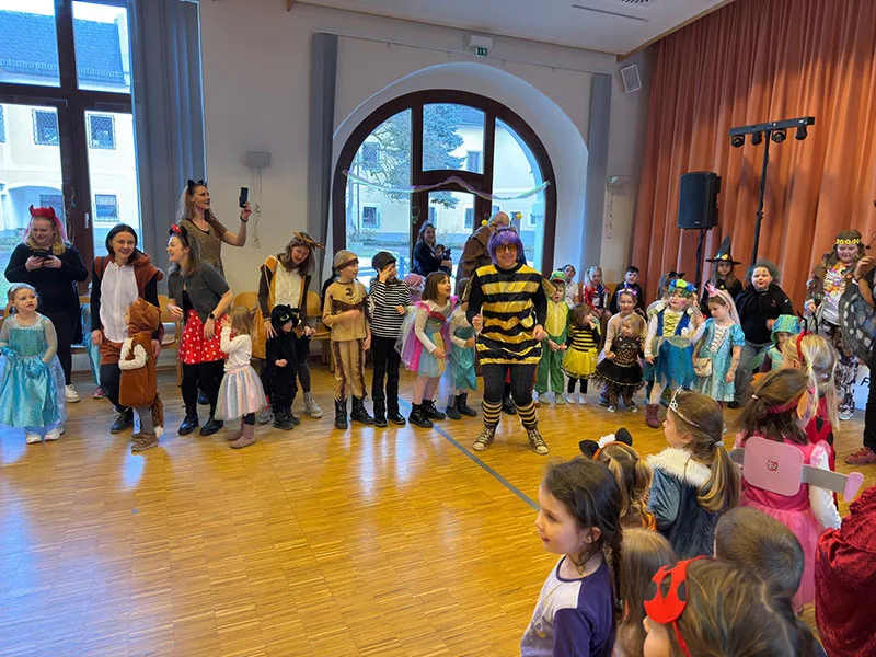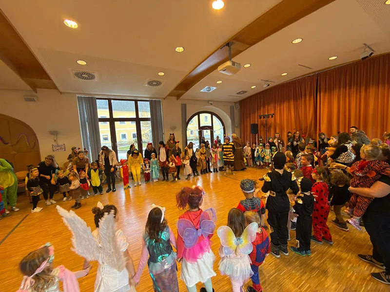 Faschingshits getanzt. Auch die Erwachsenen waren motiviert dabei und tanzen fleißig mit beim Vogerltanz, dem Fliegerlied oder dem diesjährigen Faschingshit "Octopus" von der OÖ Band Mountain Crew.