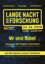 Unter dem Motto „Spurensuche: Wo komm ich her & was erlebten meine Vorfahren?“ lädt das Museum der Region Vorchdorf & der Heimatverein Vorchdorf zur Langen Nacht der Forschung ein. Die Besucher erwartet ein abwechslungsreicher Abend rund um Familiengeschichte, historische Forschung und das Entdecken der eigenen Wurzeln – spannend, interaktiv und für alle Altersgruppen geeignet.