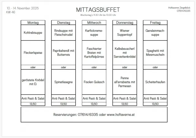 | Hoftaverne Ziegelböck Mittagsbuffet Mo - Fr von 11:30 - 13:30 Uhr Donnerstag, 20. Nov.: Dinner & Crime www.crime-club.at dienstags Backhendl donnerstags Burger jeweils ab 17 Uhr Lambacherstraße 8 Reservierungen unter: 07614 6335 www.hoftaverne.at |