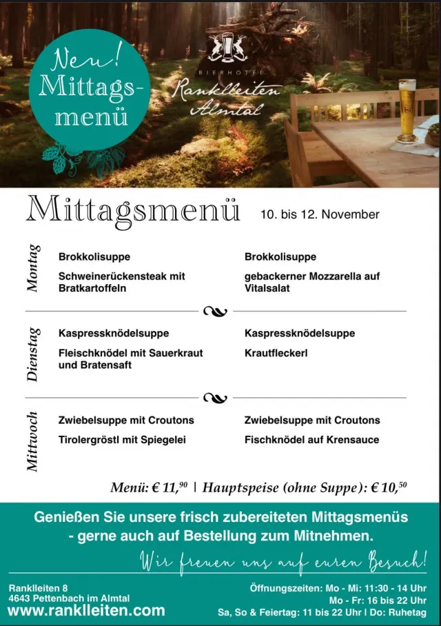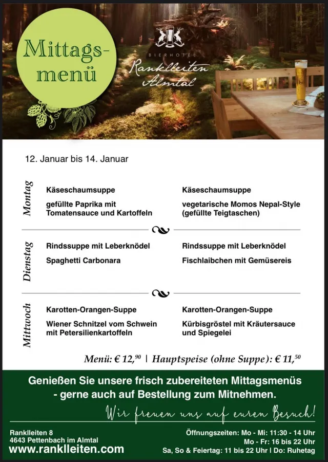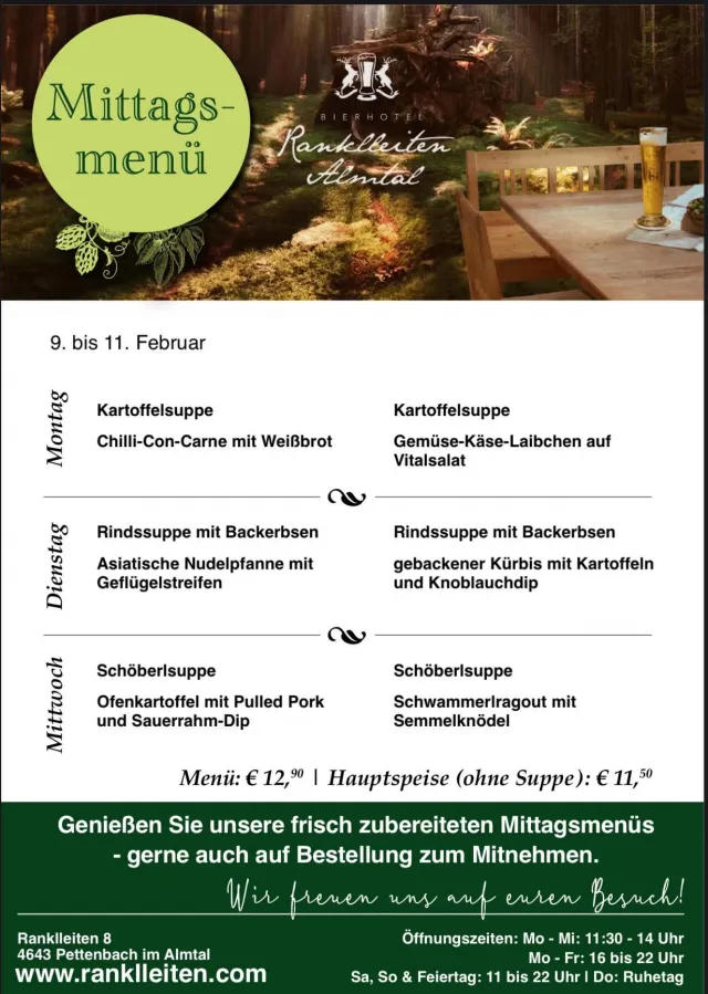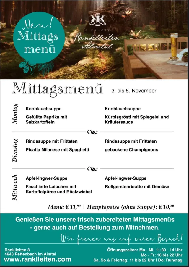 | Unsere Öffnungszeiten: Montag bis Freitag 16 bis 22 Uhr Samstag, Sonntag und Feiertag: 11 - 22 Uhr dienstags Knödel-Genuss mittwochs Burger-Spezial Donnerstag Ruhetag freitags Ripperl & Bier auf Vorbestellung: Chill, Grill & Drink Beer! samstags auf Vorbestellung: Überraschungsmenü mit Bierbegleitung 0699/1413 3140 - info@ranklleiten.com www.ranklleiten.com |