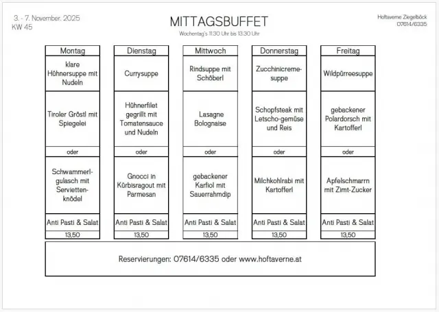 | Hoftaverne Ziegelböck Mittagsbuffet Mo - Fr von 11:30 - 13:30 Uhr Wildwochen bis 9. November Donnerstag, 20. Nov.: Dinner & Crime www.crime-club.at dienstags Backhendl donnerstags Burger jeweils ab 17 Uhr Lambacherstraße 8 Reservierungen unter: 07614 6335 www.hoftaverne.at |