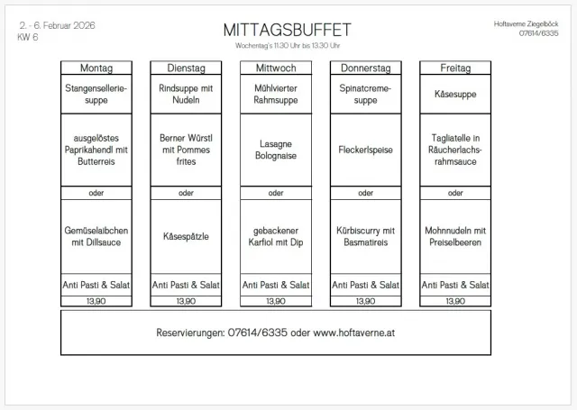| Hoftaverne Ziegelböck Mittagsbuffet Mo - Fr von 11:30 - 13:30 Uhr dienstags Backhendl donnerstags Burger jeweils ab 17 Uhr Lambacherstraße 8 Reservierungen unter: 07614 6335 www.hoftaverne.at |