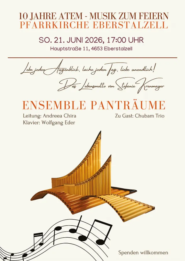 Andreea Chira gestaltet Krenmayer ein Konzert, das Hoffnung, Dankbarkeit und Lebensfreude zum Ausdruck bringt. Mit diesem besonderen musikalischen Abend mit ca. 24 Panflötistinnen und Panflötisten möchte sie mit allen Mitwirkenden die Kraft des Lebens feiern und lädt herzlich zu diesem bewegenden Panflötenkonzert ein.