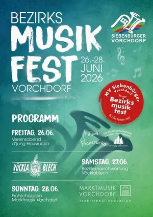 Datum Freitag, 26.06 bis Sonntag, 28.06.2026 , Ganztägig Wo Vorchdorf Veranstalter Musikverein Siebenbürger Vorchdorf mit dem OÖ Blasmusikverband Bezirk Gmunden SAVE THE DATE - weitere Details folgen Termin für deinen Kalender speichern (ics-Datei)