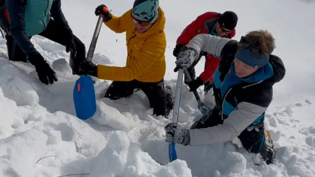 Du übst den sicheren Umgang mit dem Lawinenverschütteten-Suchgerät (LVS), das richtige Sondieren sowie effiziente Schaufeltechniken. Ergänzend dazu vertiefst du zentrale Inhalte aus dem Theorieteil*