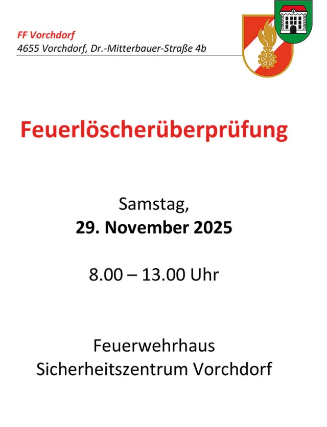 Datum Samstag, 29.11.2025 , 08 Uhr bis 13 Uhr Wo Feuerwehrhaus im Sicherheitszentrum Vorchdorf, Dr.-Mitterbauer-Straße 4b Veranstalter FF Vorchdorf Termin für deinen Kalender speichern (ics-Datei)