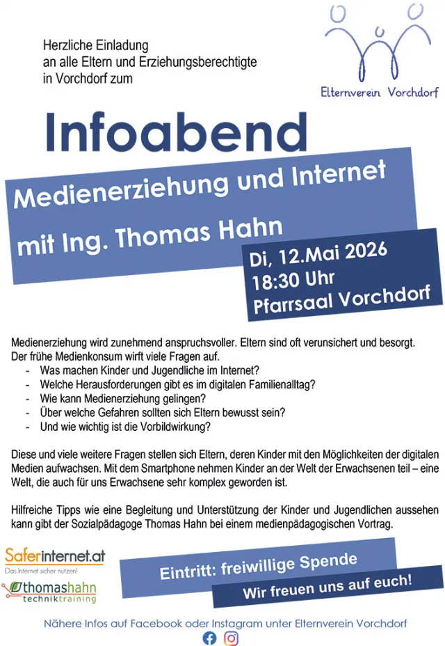 Datum Dienstag, 12.05.2026, 18:30 Uhr Wo Pfarrsaal Vorchdorf Veranstalter Elternverein Vorchdorf Eintritt: freiwillige Spenden Termin für deinen Kalender speichern (ics-Datei)
